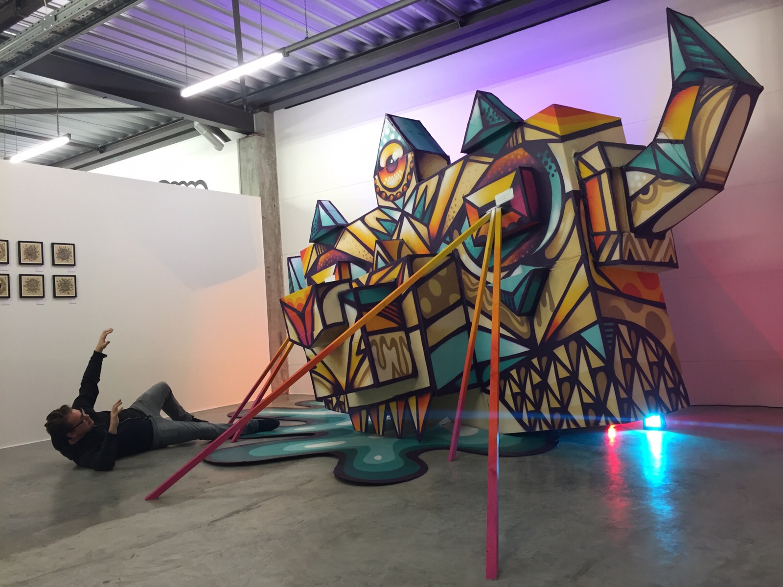 Base23 is an artist living and working in Berlin. His sources of inspiration for his graffiti, ink drawings, canvas works and cardboard installations come from a wide range of sources. These include psychedelic art of the 1960s, underground comics from the 1970s, Japanese robots and robot toy packaging, experiences from his stay in Hong Kong, typography and traditional patterns and fabrics. As an artist, Base23 combines these inspirations into his unique graphic style. His passion for detail can be found in his large murals as well as in his delicate works on paper and canvas. His main intention is to counteract the fleeting way that we observe things in our image-drenched world and instead invite the spectator to stay and contemplate his works.