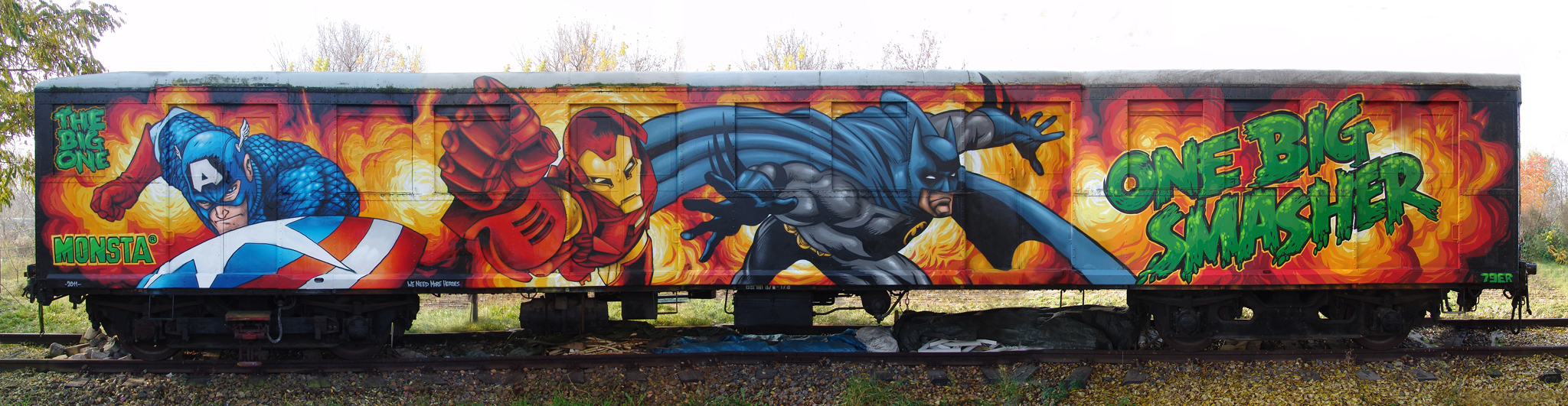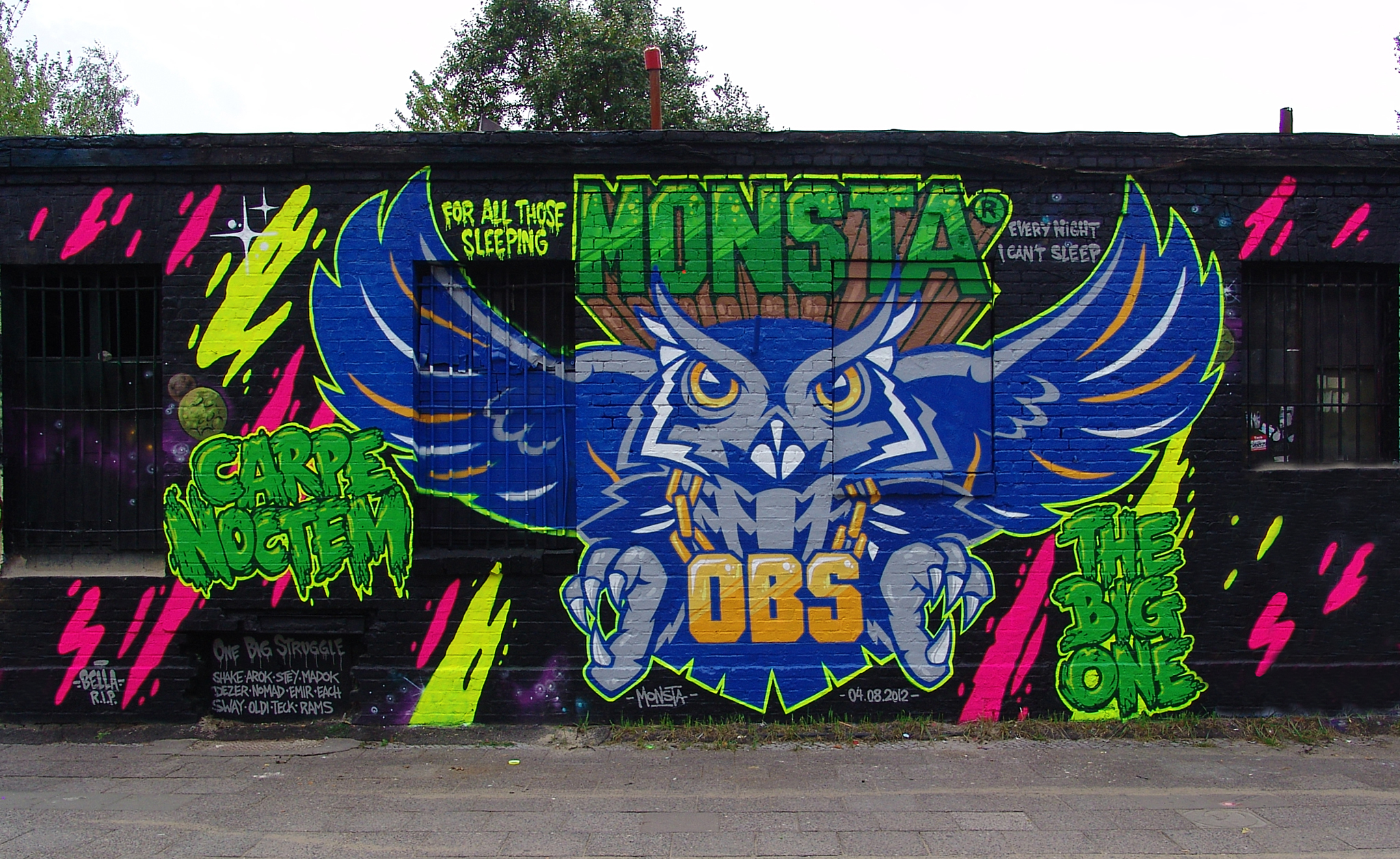 Monsta179 has been an active graffiti writer since 1994 and is a member of the OBS crew. Mainly he paints in the Berlin-Brandenburg area, but also if he is abroad. Over the years, he has used different names but always paints for the OBS crew. He creates classic graffiti, letters, characters and backgrounds. He prefers to create colorful and clear artwork with a lot of details. He has a passion for comics, which you can see in his graffiti. Apart from creating street art, he also does commissioned work, though this work has nothing in common with his graffiti. He clearly separates those parts of his life. His work has never been exhibited and is hard to find online. THE HAUS is the first public exhibition he is participating in. From now on he plans to attend more art and graffiti projects.