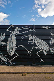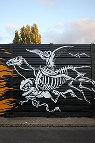 Birne is a graffiti artist who lives in Wuppertal, Germany. He is known for his diverse graphical and dancing-letter styles. Besides classical style writing, his creations also involve media film, installation, graphics and sketches. In the last ten years he has called attention to himself with his art pieces as well as large-sized conceptual murals.