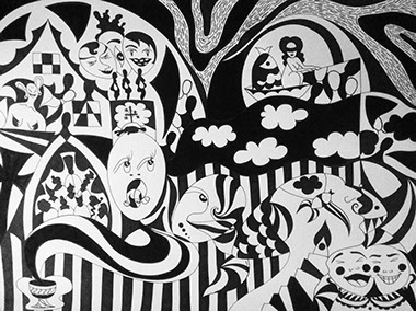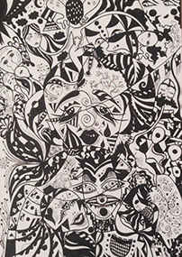 One discovers new images and worlds again and again. This allows for a look into the emotional world of the young Russian. Between heaven and hell, there is nothing that is not floating into the harmony of those plain images, which are created with nothing more than a marker.