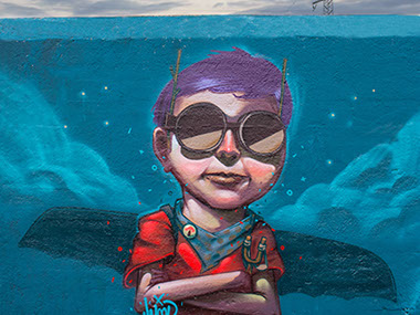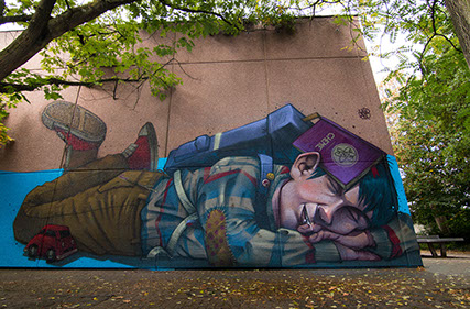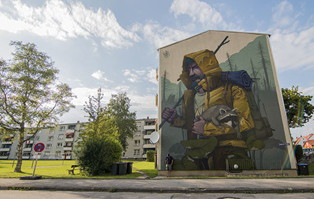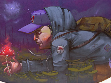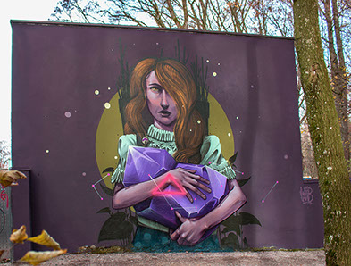 Mr. Woodland grew up and still lives in Erding, a small town close to Munich. He sprayed his first graffiti in 1993 at the age of 12. He only works with characters and describes his style as a combination of illustration, surrealism and graphic elements with a focus on high and large walls. Everything is very picturesque and leaves space for interpretation. He does not see himself as a graffiti writer, though he has roots in graffiti writing. He is just painting and does not put himself into a certain category. As a graphic designer, he runs the creative studio TOXIC PLAYGROUND that specializes in design, photography and urban art. He has painted artworks and attended exhibitions in various European countries.