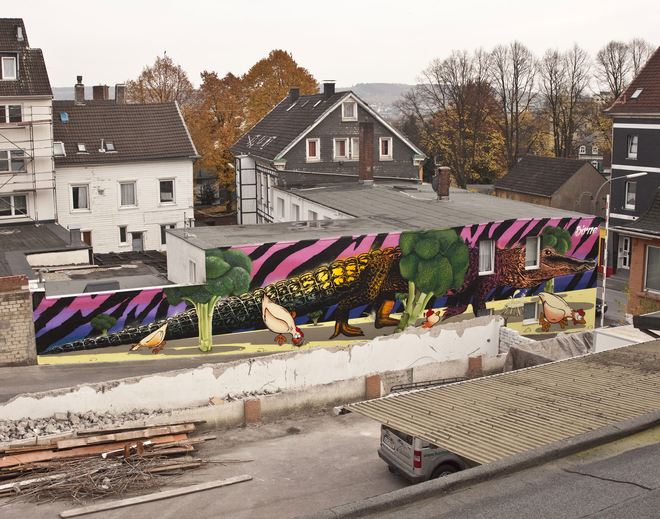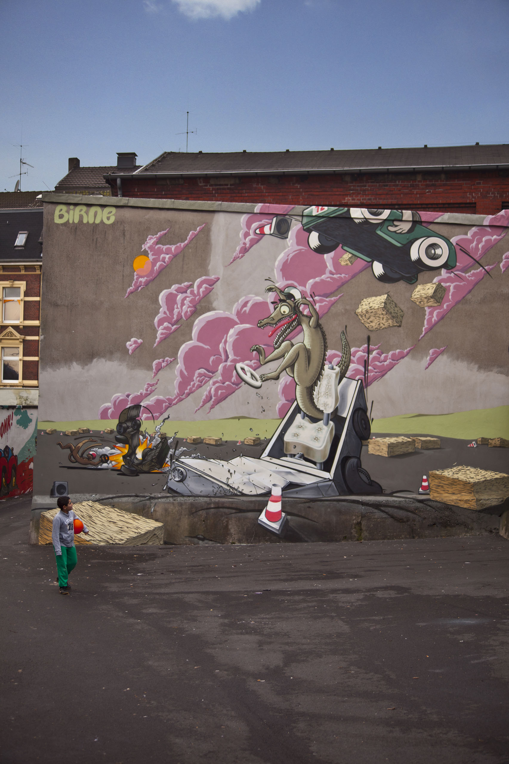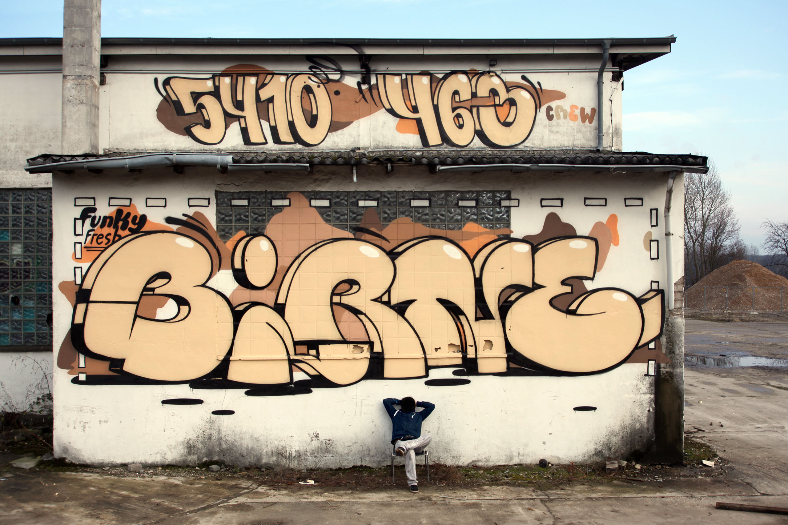 Birne is a graffiti artist who lives in Wuppertal, Germany. He is known for his diverse graphical and dancing-letter styles. Besides classical style writing, his creations also involve media film, installation, graphics and sketches. In the last ten years he has called attention to himself with his art pieces as well as large-sized conceptual murals.