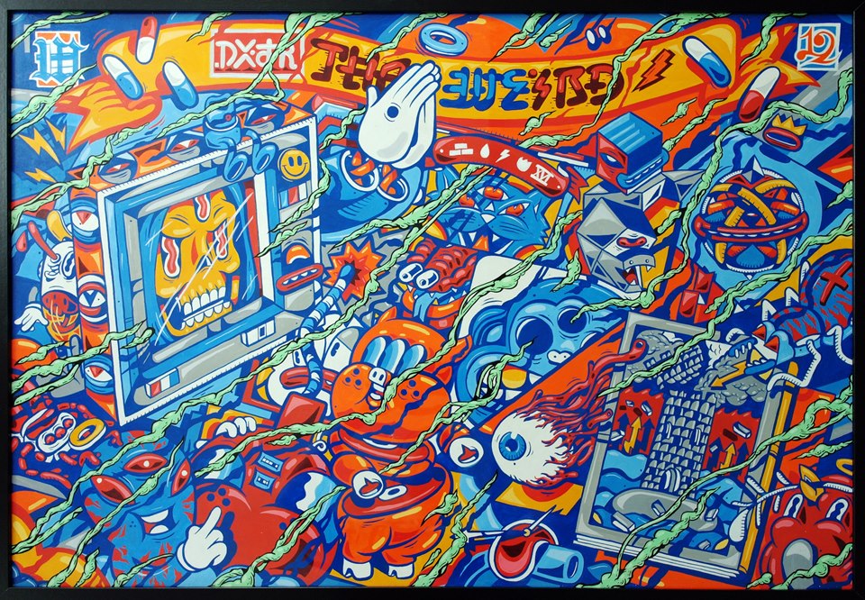 DXTR is an artist and illustrator based in Berlin. He started graffiti writing at 16 and has been developing his style ever since. His passion is sketching letters and characters. DXTR has a bold and vibrant style with a touch of cubism. He uses surfaces like walls and canvases to present his artworks. By creating crazy characters, DXTR’s work is wild yet wickedly clean. Since September 2011 he has been part of the art collective THE WEIRD together with his friends, a group of 10 urban artists spread throughout Europe, who focus on large-scale murals.