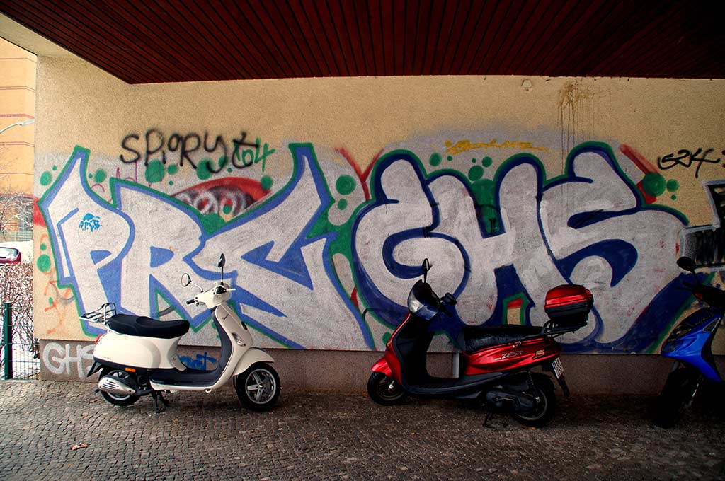 BAS2 & ROCCO aka GHS – Ghettostars is a writer crew that was founded in 1991. In the beginning, they were focused on the New York style. They are internationally known for their huge pieces. GHS is one of the last old school crews that is still active. Fresh and colorful pieces are as important as bombings in the public space. Members like WESP, KHAN and BAS2 have been writing since 1986 and have not lost their love for letterings. There are also younger members, like Rocco, who flies the flag for GHS by sending fresh trains into traffic. Or Leroy who likes it as colorful as it gets. The most important thing for GHS is the brotherhood. From the beginning the maxim of GHS has been: “One god, one mind, one crew GHS!”. The members are: WESP, ROCCO, BAS2, KHAN, DOK, LEROY, KEEN, SKUME, HULK, SOME, LEVEL, VEN1.