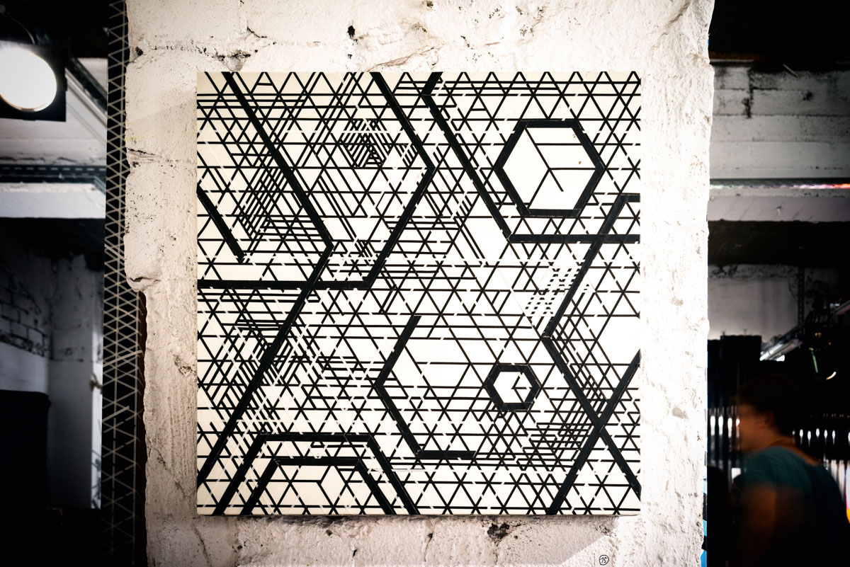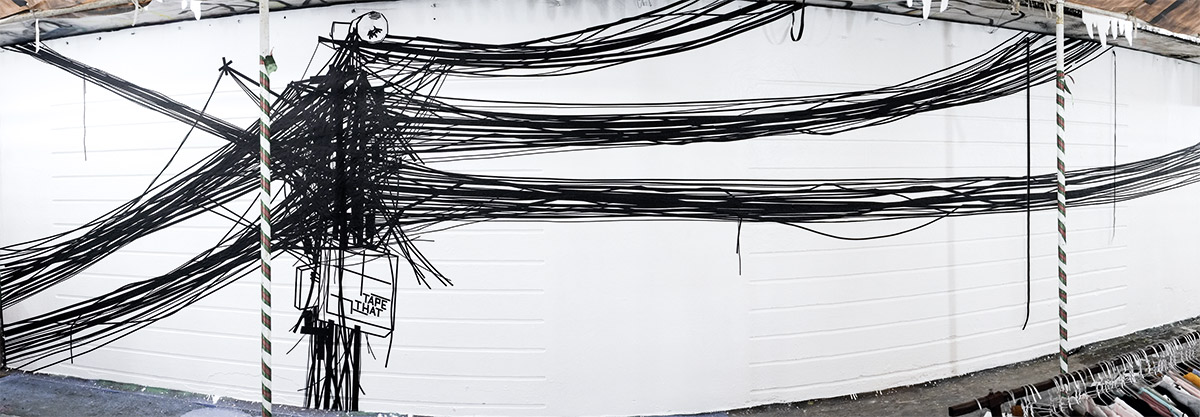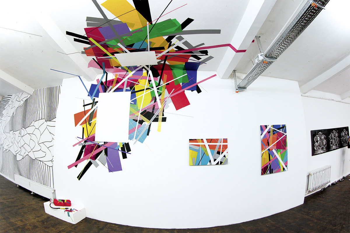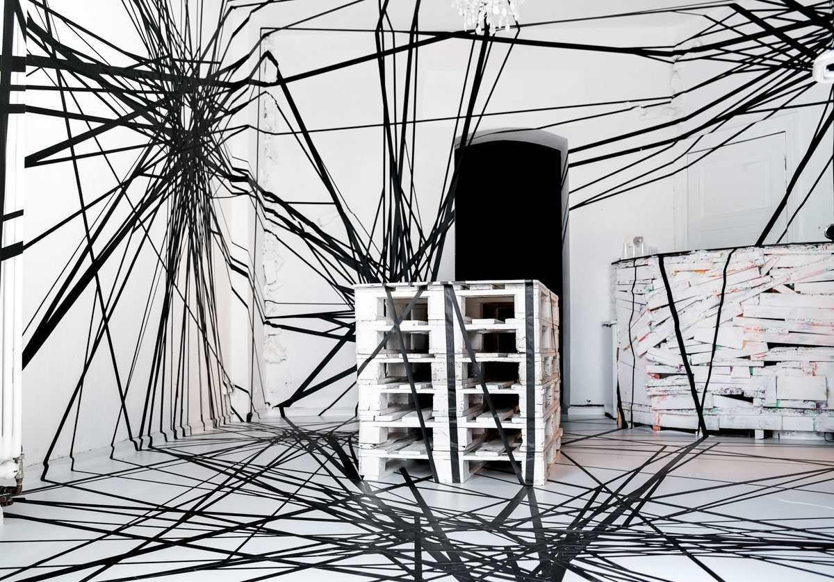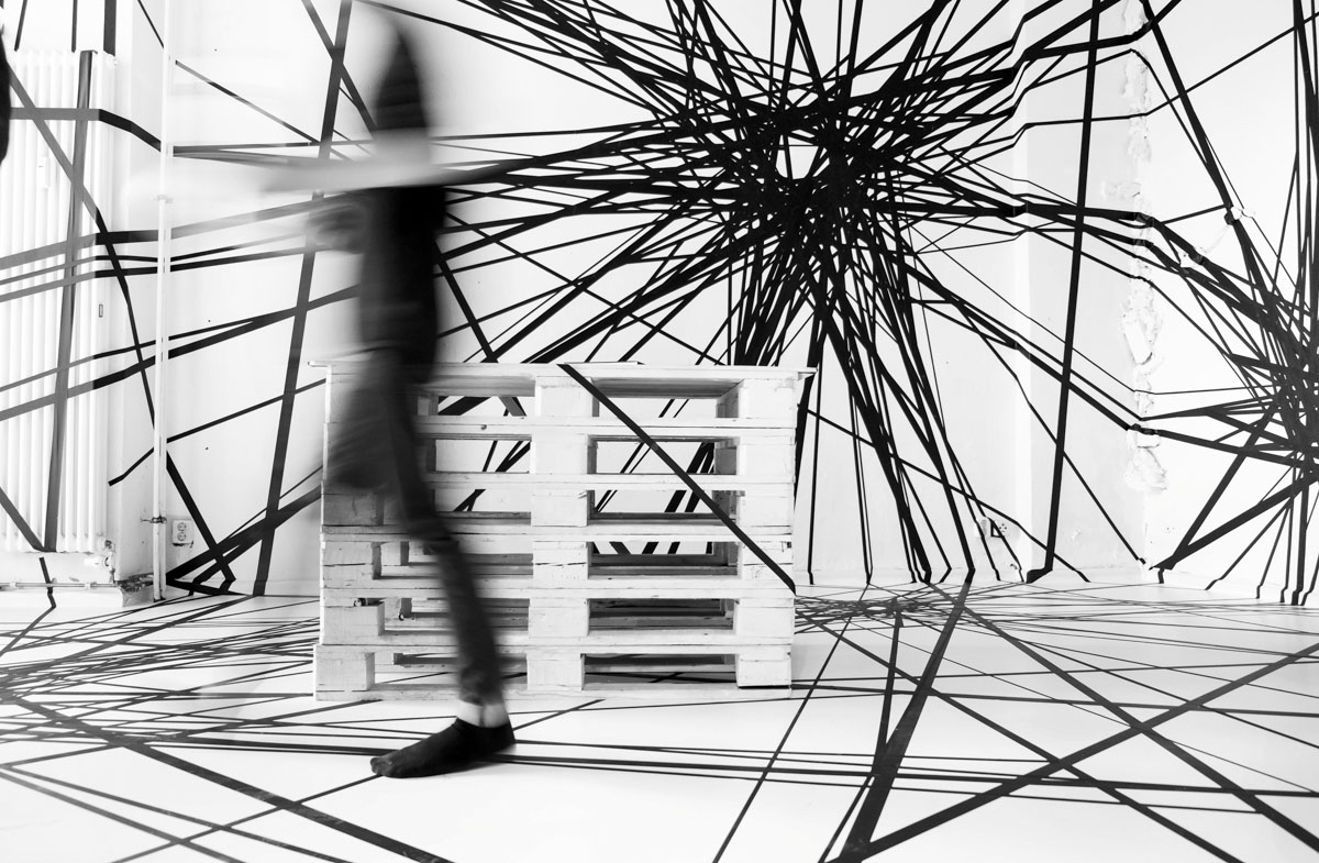The works are essentially created out of adhesive tape which every member discovered independently from each other in their creative processes. Inspired by the possibility of creating something new out of an everyday object, they use tape to create complex and intricate structures or colorful tape and light installations as well as minimalistic black and white murals and room-installations.